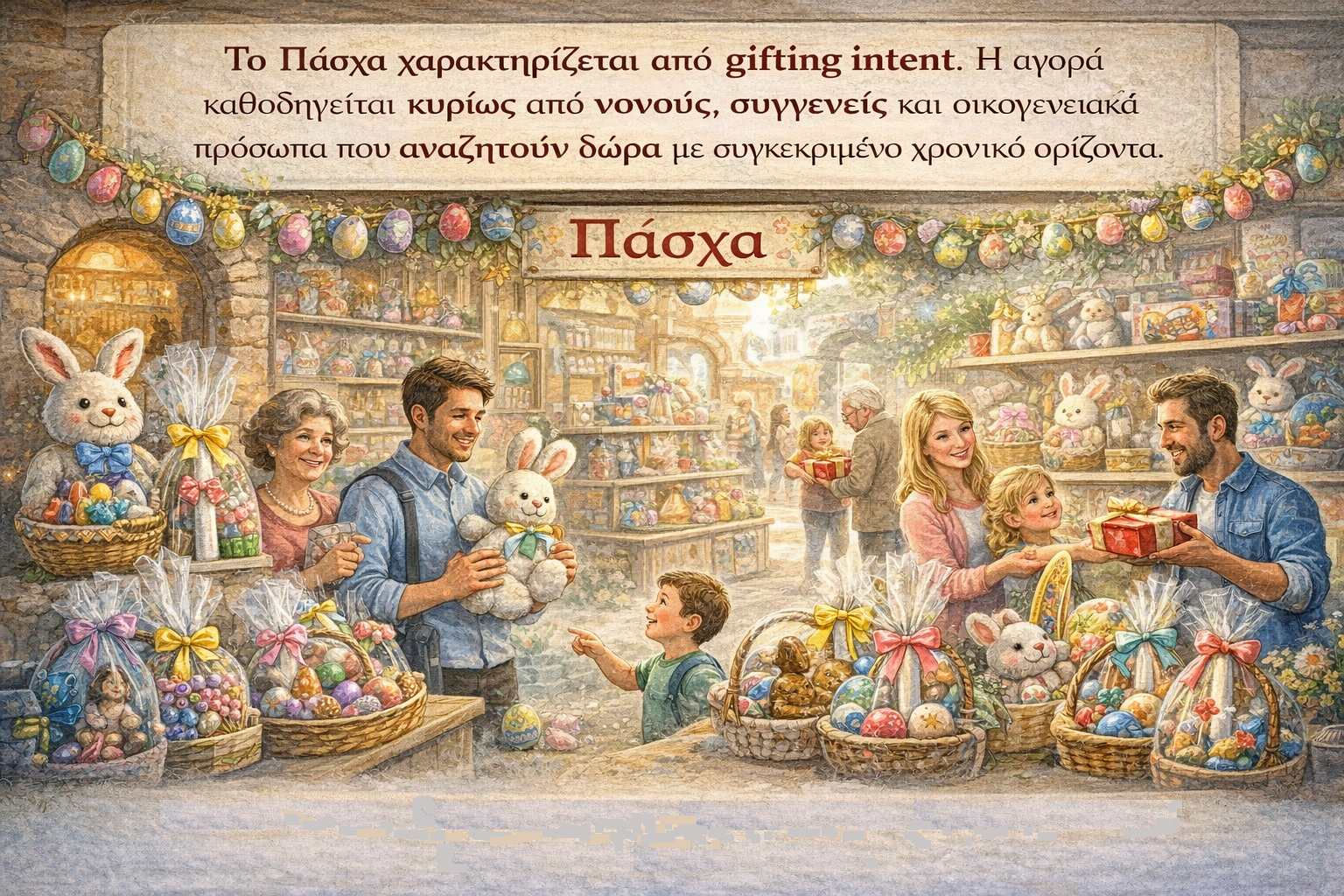 Το Πάσχα χαρακτηρίζεται από gifting intent. Η αγορά καθοδηγείται κυρίως από νονούς, συγγενείς και οικογενειακά πρόσωπα που αναζητούν δώρα με συγκεκριμένο χρονικό ορίζοντα. Το παράθυρο πωλήσεων είναι μικρό, αλλά η ένταση υψηλή. Η απόφαση αγοράς επηρεάζεται από το συναίσθημα, το licensing, τη συσκευασία και το “wow factor”, ενώ τα προϊόντα είναι κατά κανόνα μεσαίας τιμής, συχνά impulse-driven και έντονα εποχικά.