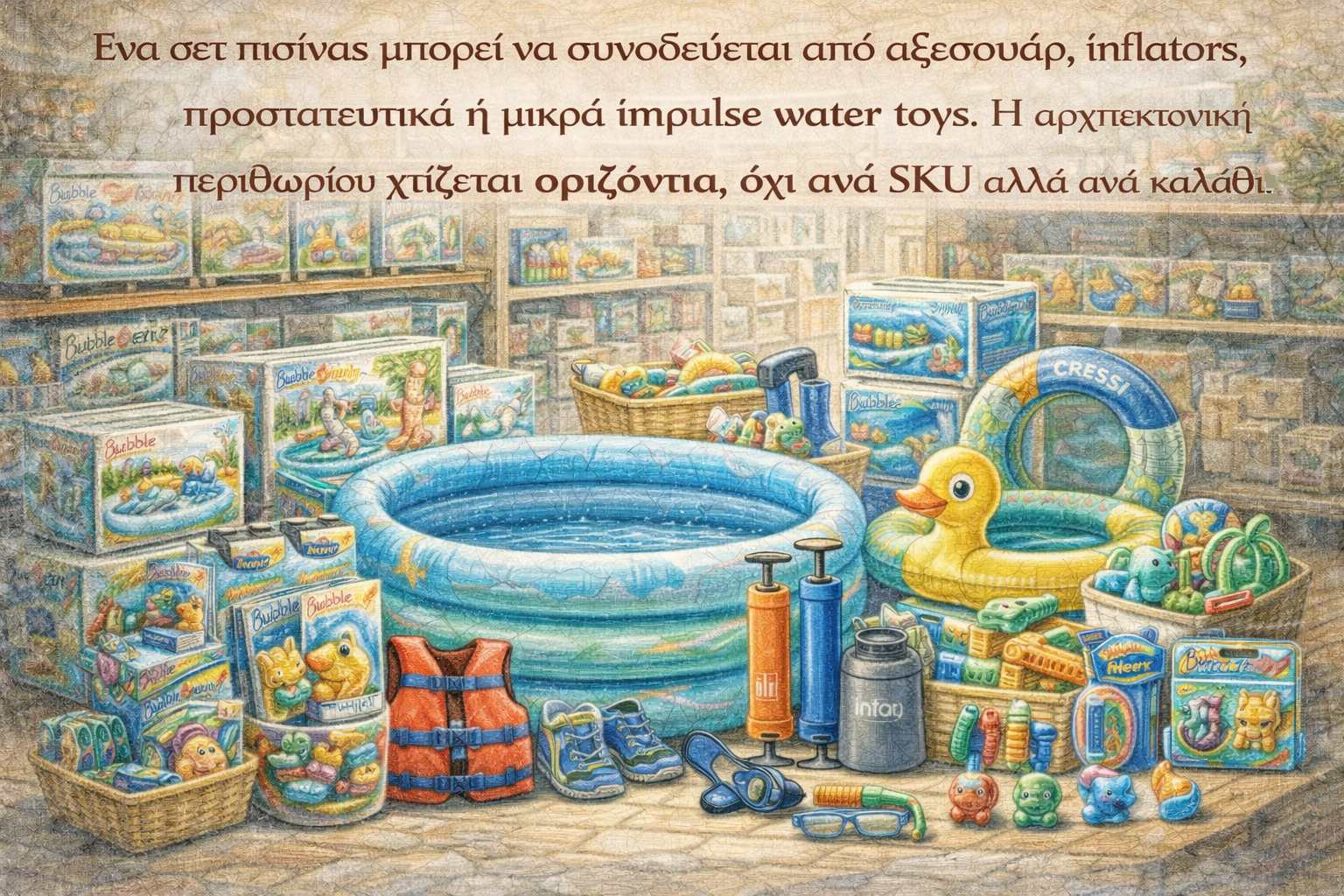 Η στρατηγική μετατοπίζεται από margin-led πωλήσεις σε volume-led ανάπτυξη. Αυτό σημαίνει ότι ο retailer οφείλει να αναζητήσει συμπληρωματικές κατηγορίες με υψηλότερο margin για cross-selling. Για παράδειγμα, ένα σετ πισίνας μπορεί να συνοδεύεται από αξεσουάρ, inflators, προστατευτικά ή μικρά impulse water toys. Η αρχιτεκτονική περιθωρίου χτίζεται οριζόντια, όχι ανά SKU αλλά ανά καλάθι.