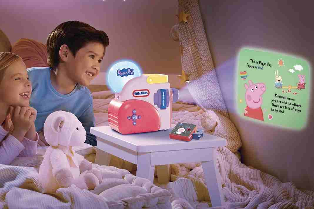Το Little Tikes Story Dream Machine Starter Pack περιλαμβάνει τρεις ιστορίες από το σύμπαν της Peppa Pig, καθώς και μια συσκευή προβολής τοίχου που διευκολύνει την ανάγνωση και μια φιγούρα που προσφέρει πρόσθετα φωτιστικά εφέ.