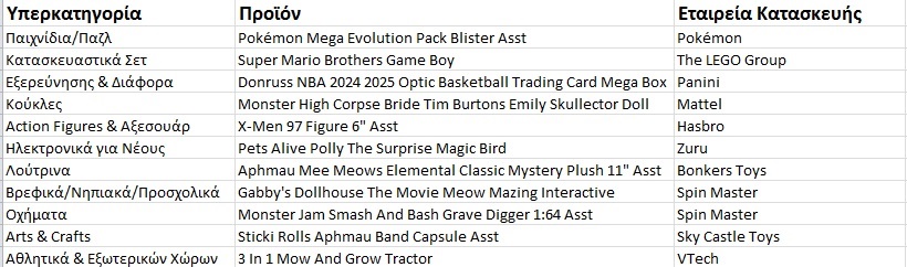 Οι 7 από τις 11 υπερ-κατηγορίες που παρακολουθεί η Circana σημείωσαν αύξηση σε αξία πωλήσεων, με τις 6 από αυτές να παρουσιάζουν και αύξηση σε τεμάχια. Η κατηγορία που αυξήθηκε ταχύτερα ήταν τα Παιχνίδια/Παζλ, με βασικό μοχλό ανάπτυξης το Pokémon. Ακολούθησαν τα Εξερεύνησης & Διάφορα, όπου οι αθλητικές συλλεκτικές κάρτες συνεχίζουν να αυξάνουν τις πωλήσεις, και τα Κατασκευαστικά Σετ, όπου η Formula 1 ήταν ο μεγαλύτερος παράγοντας ανάπτυξης. Οι μεγαλύτερες μειώσεις σημειώθηκαν στις κατηγορίες Αθλητικά & Εξωτερικών Χώρων, Λούτρινα και Κούκλες. Σχετικά με το ποιες κατηγορίες παιχνιδιών αναμένεται να είναι «καυτές» την εορταστική περίοδο, παρακάτω παρουσιάζεται η λίστα με τα κορυφαία νέα παιχνίδια ανά υπερκατηγορία για τον Σεπτέμβριο 2025: