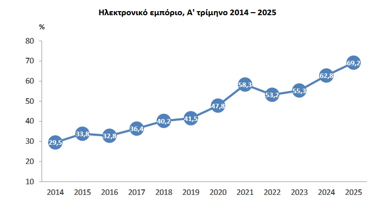 Σύμφωνα με την έρευνα, το ηλεκτρονικό εμπόριο βρίσκεται σε άνοδο στη χώρα μας, με το 69,2% του πληθυσμού ηλικίας 16 – 74 ετών που έχουν οποτεδήποτε χρησιμοποιήσει, έστω και μία φορά, το διαδίκτυο, να έχουν πραγματοποιήσει, κατά το Α΄ τρίμηνο του 2025, κάποια ηλεκτρονική αγορά ή παραγγελία αγαθών ή υπηρεσιών μέσω του διαδικτύου, για προσωπική χρήση. Σε σύγκριση με το αντίστοιχο ποσοστό ένα έτος πριν (62,8%), καταγράφεται αύξηση 6,4 ποσοστιαίων μονάδων, ενώ έχει υπερδιπλασιαστεί σε σύγκριση με το 2014 (29,5%)