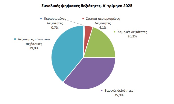 Επίσης, περισσότεροι από 7 στους 10 (74,9%) ηλικίας 16 – 74 ετών έχουν τουλάχιστον βασικές ψηφιακές δεξιότητες, όπως φαίνεται στο παρακάτω γράφημα.