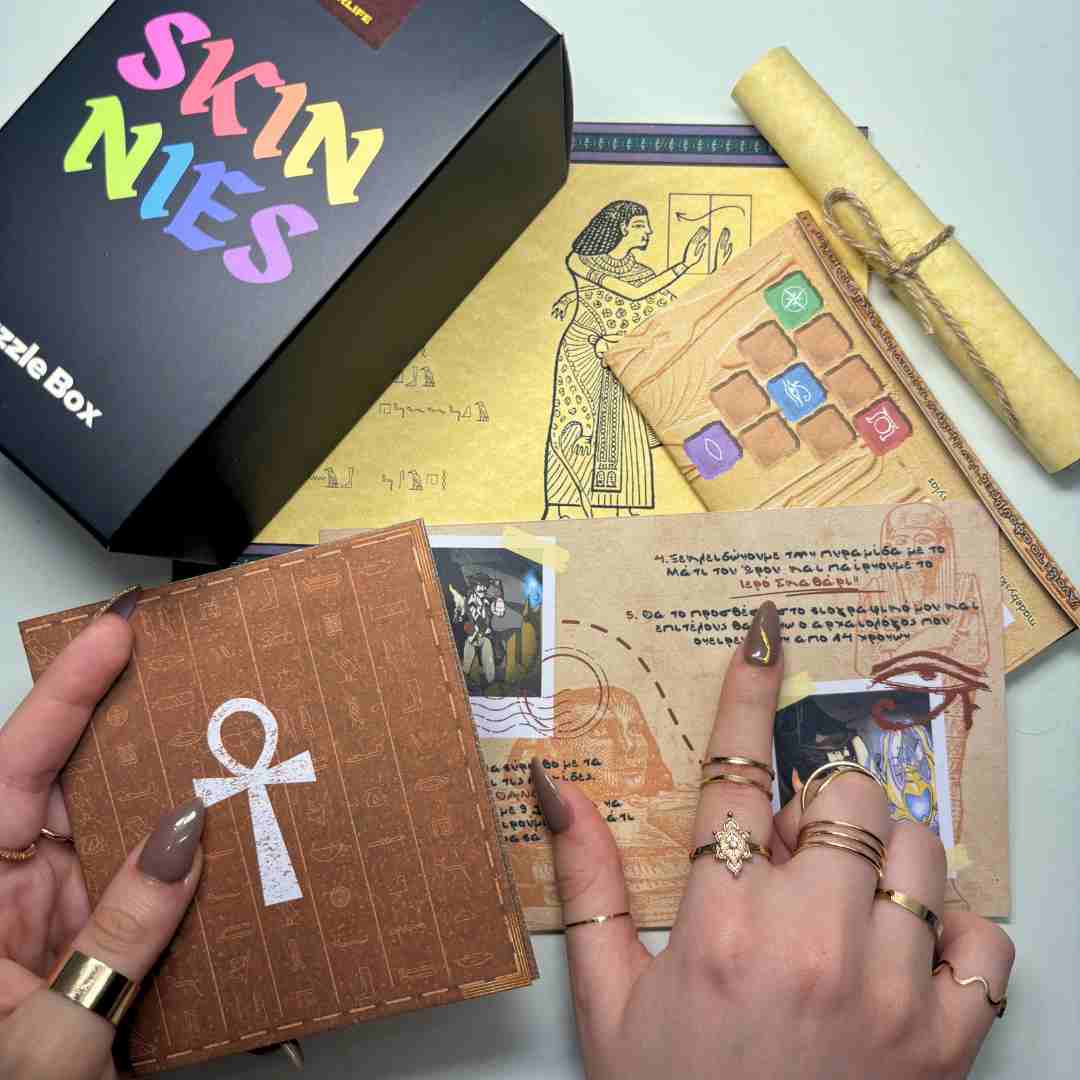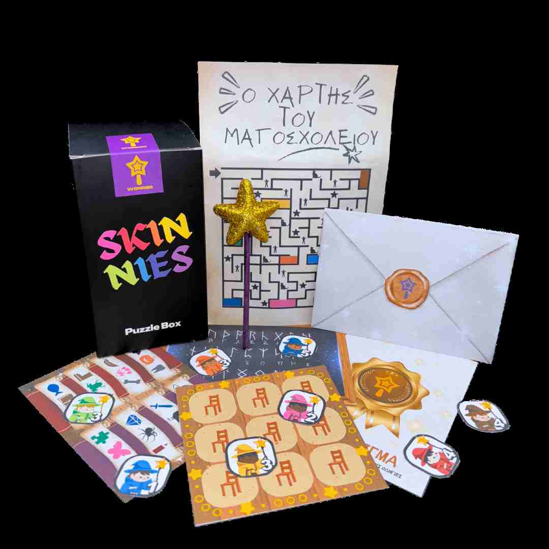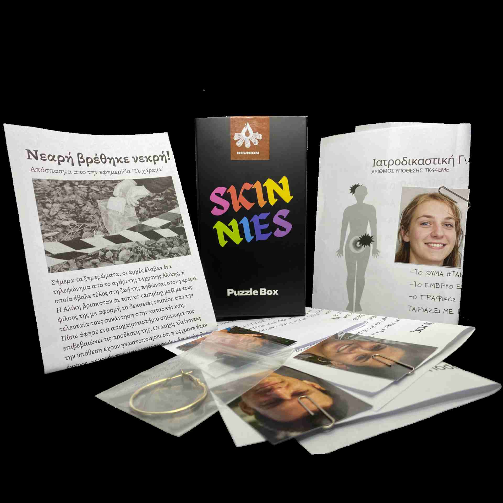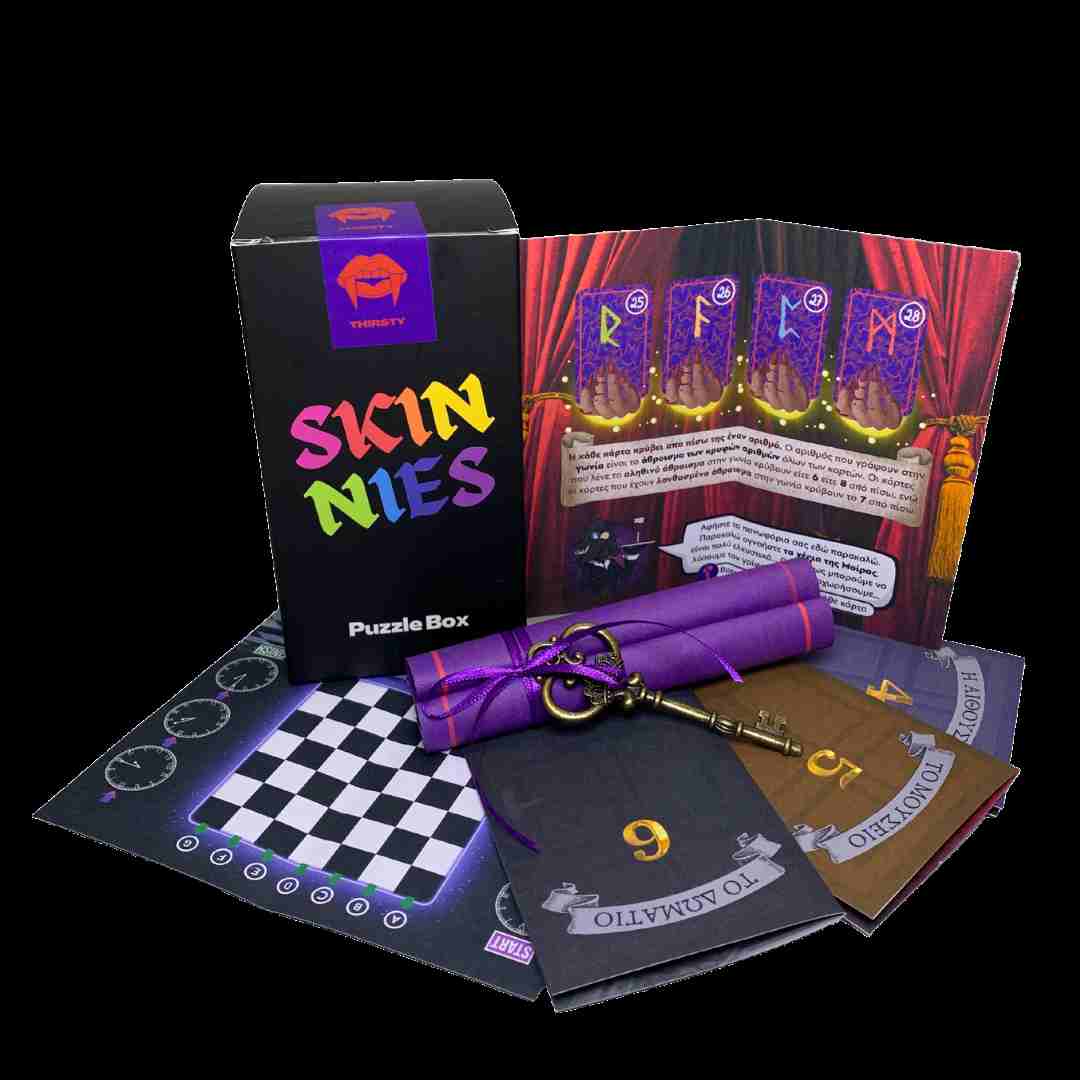 Τα κουτιά γρίφων Made by Skinnies είναι χειροποίητα (φτιάχνονται στην Ελλάδα) επιτραπέζια στα ελληνικά που ταξιδεύουν τους παίκτες μέσω της πρωτότυπης ιστορίας και του μοναδικού γρίφου που παρουσιάζει το καθένα.