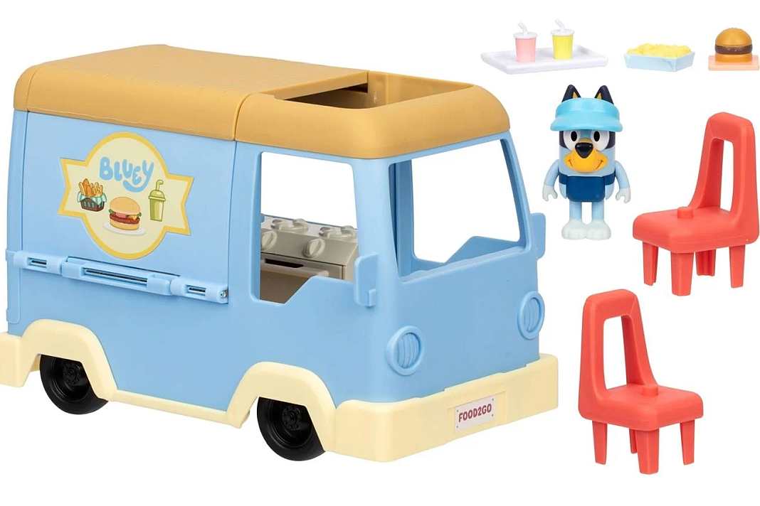 Το φορτηγό μετατρέπεται εύκολα σε καφετέρια με τραπέζι και καρέκλες, ενώ το αναδιπλούμενο ταβάνι αποκαλύπτει πολύχρωμο μενού γεμάτο σνακ. Περιλαμβάνονται 5 αξεσουάρ παιχνιδιού για σερβίρισμα, καθώς και αποκλειστική φιγούρα Bluey 7,5 εκ. με ποδιά και καπέλο, έτοιμη να μαγειρέψει όπως στη σειρά!