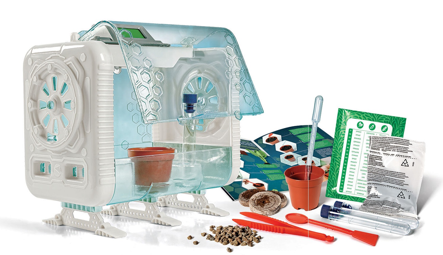 Υπάρχει δυνατότητα πειραματισμού με διαφορετικές καλλιέργειες. Διαθέτει ηλεκτρονική μονάδα ελέγχου των συνθηκών και δίνει τη δυνατότητα πειραματισμού με τρεις διαφορετικούς τρόπους καλλιέργειας (σπορά σε τύρφη, ανάπτυξη φυτού σε βαμβάκι, υδροπονική καλλιέργεια).